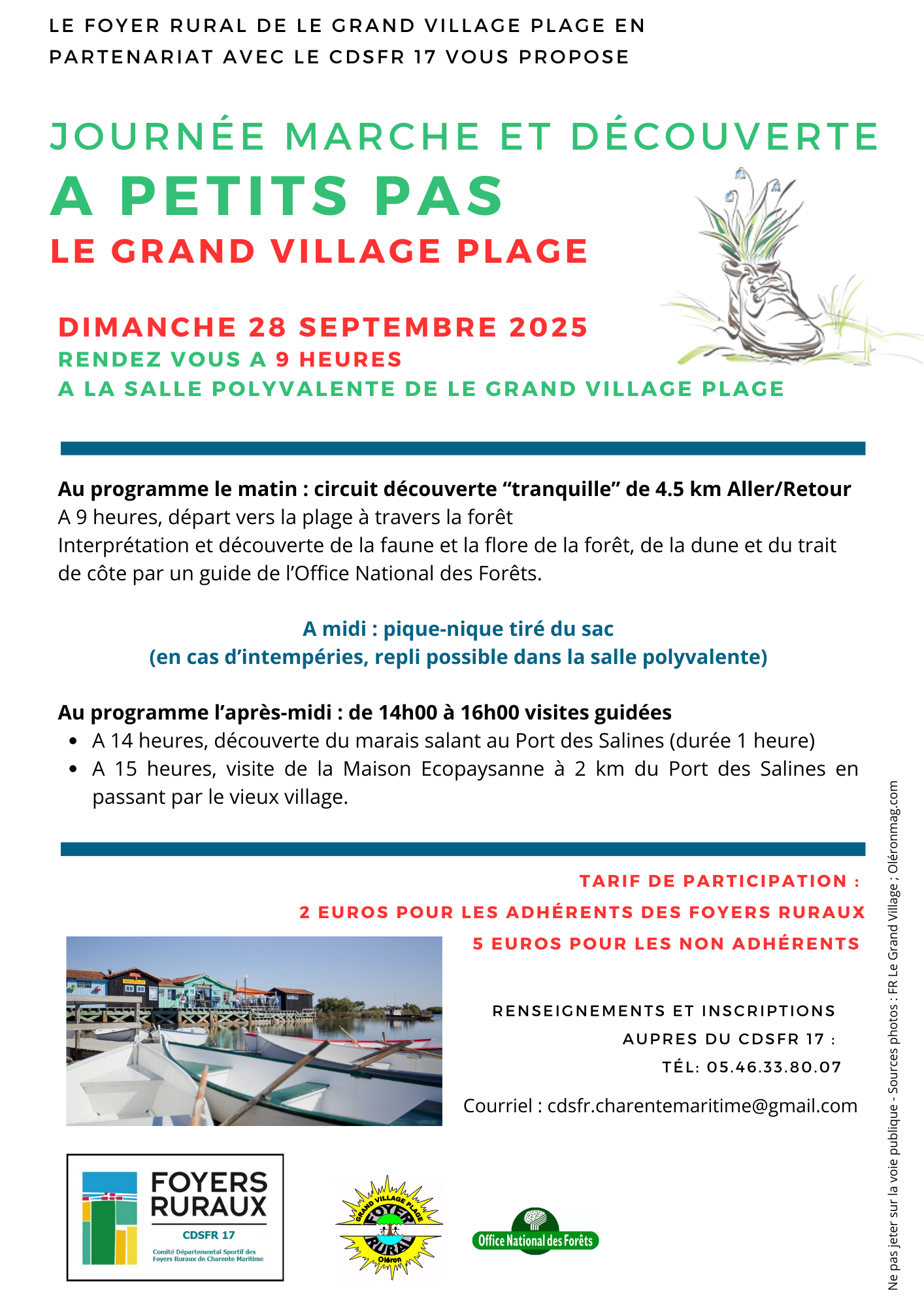 A ce titre, nous vous rappelons que nos administrateurs sportifs ont organisé pour les adhérents et non adhérents aux foyers ruraux une journée de marche et de découverte à Le Grand Village Plage, dimanche 28 septembre 2025 (voir affiche publiée ci-après). Nos adhérents bénéficient d’une réduction tarifaire pour les visites.